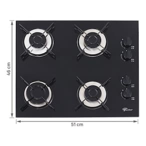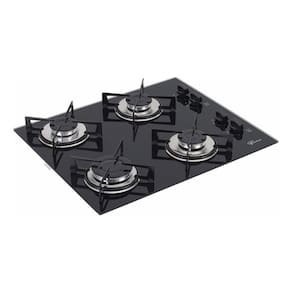 Cooktop Fischer a gás com 4 bocas, acendimento automático, estrutura em vidro preto, grades individuais em ferro fundido e funcionamento bivolt.Luz de calor residual