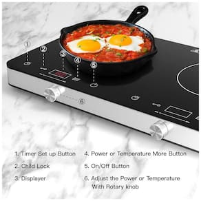 Aquecimento rápido A indução dupla Cooktop é mais rápida que um queimador de indução dupla padrão. Comparado com o fogão de indução tradicional, tem um efeito de condução de calor mais alto, que atende a várias necessidades de cozimento, como vapor, fervura, fritura, fritura, cozimento lento. Através da operação do botão, podemos controlar o calor com mais precisão, e o design do duto de ventilação pode dissipar melhor o calor e evitar danos à bancada. Segurança para crianças garante segurança quando não estiver em uso. O cooktop de indução com botão retornará ao modo de espera após 30 segundos se não selecionar nenhuma função. Se a temperatura da superfície for superior a 60 , o LED exibirá H após o desligamento da máquina para evitar a queima do toque. Ele para de funcionar e exibir códigos relevantes na tela do display quando experimenta operações inadequadas. 10 níveis de temperatura 2 Indução do queimador Cooktop a faixa de temperatura ajustável é de 160 a 220 C, 9 níveis de potência, escolha rapidamente a energia desejada de 200W a 1800W em incrementos de 200W. Os botões sensíveis ao toque garantem a conveniência de usar, defina o tempo do seu fogão de indução variando de 1 minuto a 4 horas para garantir um bom cozimento e resultado. O fogão de indução é compatível com utensílios de cozimento de indução, variando de 12 a faixa ideal de área aquecida, como aço inoxidável, alumínio fundido, ferro fundido ou ferro esmaltado. A superfície do fogão de indução é de vidro liso de alta qualidade, que pode ser facilmente limpo com um pano úmido
