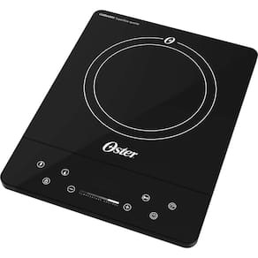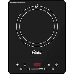 Cooktop portátil de indução Oster com controle touch, 8 seleções de temperatura (60-240°C) e timer. Possui design compacto, zona de indução em vidro cerâmico, potência de 2000W e dispositivo de segurança com pés antiderrapantes.Luz de calor residual