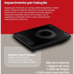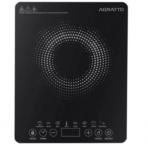 Cooktop de Indução Agratto com 1 boca, painel digital touch, 8 modos pré-programados, controle de temperatura com 8 níveis, trava de segurança e pés antiderrapantes.Luz de calor residual