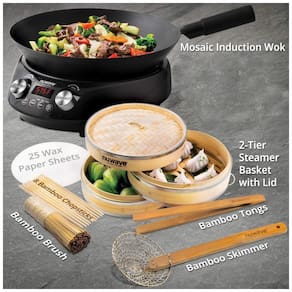Com a combinação da base de indução Mosaic e do wok de aço carbono, agora você pode obter o Wok Hei para infundir aromas e sabores carbonizados complexos em seu prato favorito. O pacote de cozimento wok mais completo de todos os tempos inclui tampa de vidro temperado, suporte para wok em aço inoxidável e grelha para fritar, além de um kit de acessórios de bambu de 8 peças com um livro de receitas criado por 90 Chefs.