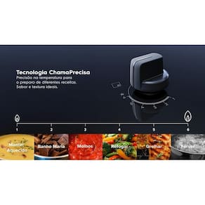 Tenha mais precisão na temperatura para o preparo de diferentes receitas. A Tecnologia ChamaPrecisa oferece 6 níveis pré-programados de potência1, conferindo sabor e textura ideais aos seus pratos. Confira os níveis: 1 - Derreter e Manter Aquecido; 2 - Preparos em panela de pressão e Banho-Maria; 3 - Preparar Molhos; 4 - Refogar; 5 - Grelhar e Fritar; e 6 - Ferver.