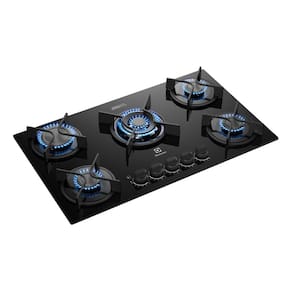 Cooktop a gás com 5 bocas, acendimento automático e chama Quadri. Design moderno em vidro preto.Luz de calor residual
