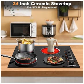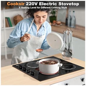 Cooktop elétrico de embutir Cooksir com 4 queimadores de indução, 9 níveis de temperatura, 220V e 6000W de potência total. Possui aquecimento por infravermelho distante, sem radiação eletromagnética, e recursos de segurança como desligamento automático e indicador de calor residual.Luz de calor residual