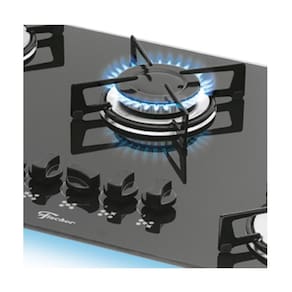 Mesa em vidro temperado preto ébano, 5 queimadores, acendimento superautomático, trempes individuais.Luz de calor residual