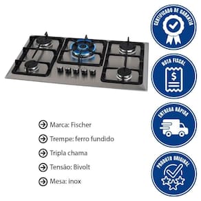 - Para que você faça a escolha certa na hora de montar seu ambiente, a Fischer apresenta o Cooktop a Gás Fischer 5 Bocas Tripla Chama Infinity com Trempe de ferro fundido Mesa Em Inox 304 Bivolt.