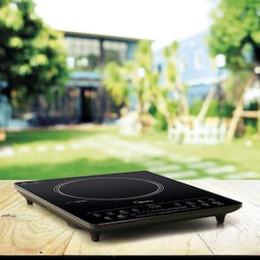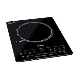 Cooktop portátil Midea com 1 boca de indução, design em vidro preto, controle touch, timer digital e potência de 1500W.Luz de calor residual