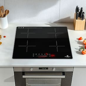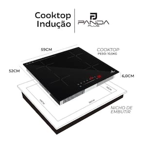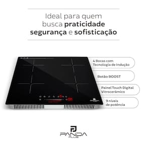 Cooktop de indução 4 bocas; mesa vitrocerâmica (vidro temperado); painel touch digital; alimentação elétrica; ignição automática; temporizador; proteção contra superaquecimento; trava de segurança.Luz de calor residual