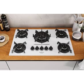 5 bocas, mesa de vidro, tripla chama, acendimento superautomático, bivolt.Luz de calor residual