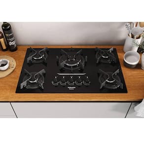 5 queimadores | Queimador Tripla Chama | Trempes em ferro fundido | Mesa em vidro temperado | Acendimento superautomático | Controle integrado na mesaLuz de calor residual