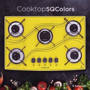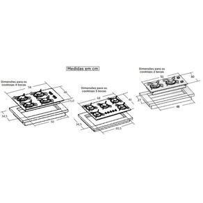 Especificações Técnicas: Cooktop 5 queimadores Vidro temperado de 6mm Acendimento super-automático Cordão selador de vedação Trempes individuais com borracha Suporte queimador em aço inox Gás GLP instalado podendo ser convertido para GN