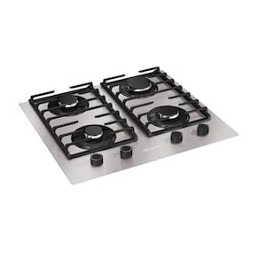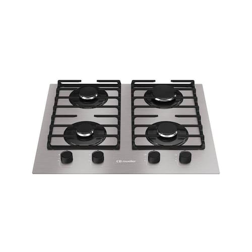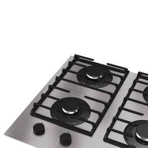 Cooktop Mueller 4 Bocas MCG4BL com mesa em alumínio escovado e grades duplas em ferro fundido, oferecendo estabilidade e resistência.Luz de calor residual
