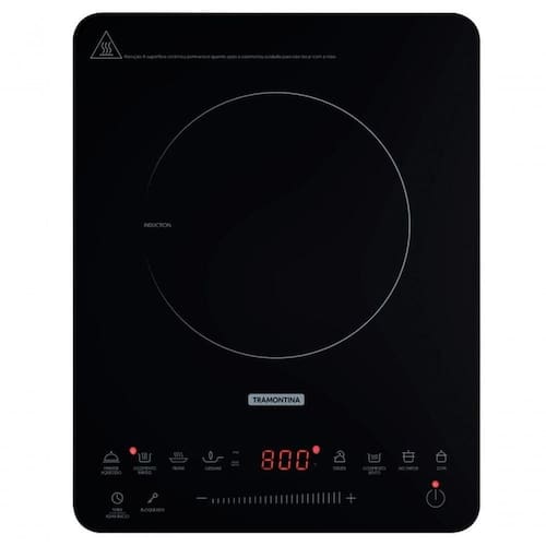 Modo de uso: O Cooktop Portátil por Indução funciona ;em 220 V, não é bivolt. Não utilize o cooktop com panelas de diâmetro superior a 260 mm. Não utilize o cooktop sobre superfícies metálicas como por exemplo, pias e bancadas de aço inox. Não bloquear as aberturas de entrada e saída de ar, a fim de evitar danos no aparelho. O cooktop portátil por indução, não deve ser instalado embutido. Nunca utilizar a mesa vitrocerâmica como superfície de trabalho ou para apoiar objetos. Se for percebida qualquer rachadura na mesa vitrocerâmica, desligar imediatamente o produto e desconectar da rede elétrica. Pessoas que utilizam marca-passo e próteses metálicas devem consultar um médico antes de utilizar o cooktop por indução. Colocar sempre a panela no centro da área de aquecimento. Para o correto funcionamento do cooktop é necessário que o fundo das panelas contenha materiais de indução magnética, ou seja, metal ferroso. As panelas mais indicadas são as de aço inox ou de ferro. As panelas utilizadas no cooktop por indução devem ter o fundo plano, para que fiquem em contato com toda a área de aquecimento. Utilize um imã para verificar se a panela é adequada para o cooktop por indução. Se o imã for atraído pela base da panela, esta é apropriada para este tipo de aparelho. Panelas que não devem ser utilizadas: barro, vidro, alumínio, cerâmica, cobre e outros materiais não magnéticos. A limpeza da superfície vitrocerâmica deve ser realizada sempre com ela fria. Entretanto, quando objetos plásticos, folhas de alumínio, e alimentos que em sua composição contenham açúcar, entrarem em contato com a superfície vitrocerâmica aquecida, será necessário retirar estes resíduos enquanto ela estiver quente, utilizando uma esponja macia umedecida com água. Após a superfície vitrocerâmica esfriar, poderá não ser possível remover estes resíduos derretidos (açúcar, plástico ou papel alumínio). Para uma limpeza perfeita a Tramontina disponibiliza a venda da pasta de limpeza, para polir e remover manchas em superfícies de vidro / vitrocerâmicas.