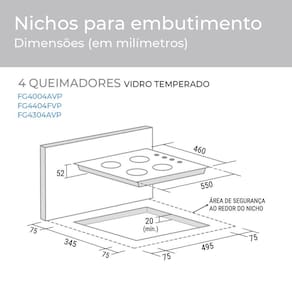 Especificações Técnicas: Modelo: FG4004AVP Voltagem: Bivolt Cor: Preto Queimadores: 4 Acendimento:Superautomático Material: Vidro temperado e aço Trempe:Aço esmaltado