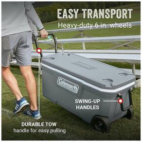 TOTALMENTE ISOLADO Tampa e corpo Mantém o gelo até 5 dias em temperaturas tão altas quanto 32 C a cor do logotipo no refrigerador pode variar PARA O LONGO CURSO Rodas de para serviço pesado e alças duráveis de reboque e oscilação projetadas para facilitar o transporte PORTA COPO COM DRENO Moldado na tampa para evitar que as bebidas derramem caber até um 900mL. copo TAMPA TER A SEAT A tampa fechada suporta até 113 kg. LINER RESISTENTE À MANCHA Para limpeza fácil bujão de drenagem de canal à prova de vazamento. FÁCIL DE ABRIR Lábio rebaixado para facilitar o acesso ao conteúdo. GRANDE CAPACIDADE Comporta até 160 latas. À PROVA DE VAZAMENTO Bujão de drenagem do canal Marca: Não Informado
