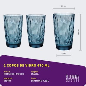 Jogo com 2 copos de vidro para água ou suco 470 ml azul linha diamond bormioli roccodetalhes do produtomaterial: vidroorigem: produto importado da itáliaproduto: copos de vidroquantidade: 02 coposcapacidade: 470 ml cada copocor: azultamanho: 14,4 cm de altura, 8,5 cm de diâmetro de bocal e 6 cm de diâmetro de basemarca: bormioli roccolinha: diamondembalagem: os produtos são cuidadosamente envolvidos por plástico bolha e inseridos em uma caixa reforçada para assegurar a integridade dos produtos no transporte. Substituímos produtos danificados no transporte.Enviodespachamos nosos produtos no prazo de 01 a 02 dias úteis após a compra.As informações de envio estão disponíveis no momento da compra.Trocas e devoluçõesseguimos todas as normas vigentes no código de defesa do consumidor.Adicionalmente, trocamos produtos danificados no transporte.Solicitamos o envio de foto demonstrando o ocorrido por mensagem e efetuaremos a troca com prioridade e sem custo para você. Informações relevantesjá imaginou beber ou servir suas bebidas em taças ou copos com classe e sofisticação A elleganza cristais comercializa produtos com preços excepcionalmente abaixo do mercado e de qualidade assegurada. Trabalhamos com produtos de espessuras variadas, livre de materiais tóxicos, com design e transparência incríveis.Sobre a bormioli roccoa bormioli rocco exporta seus produtos para mais de 100 países no mundo e representa uma das vidrarias mais importantes no cenário internacional.Fundada em 1825 na itália, hoje está dividida em duas áreas de negócio, como artigos para mesa, louça e vidros em geral. Possuem três fábricas de produção, dois estúdios de decoração, seis filiais comerciais e seis lojas próprias. Ean: 7900929098894
