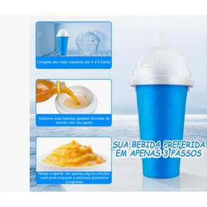Passo 1- coloque seu copo no congelador até que congele 3 a 4 horas . Passo 2- colque sua bebida gelada favorita milhares de bebidas . Passo 3 -coloque a tampa e aperte, aperte, aperte em apenas alguns minutos, você terá uma deliciosa sobremesa congelada deliciosa.