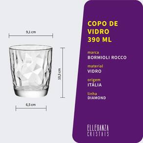DETALHES DO PRODUTO Material: Vidro Origem: Produto importado da Itália Produto: Copos de Vidro Quantidade: 06 copos Capacidade: 390 ml cada copo Tamanho: 10,3 cm de altura, 9,1 cm de diâmetro de bocal e 6,5 cm de diâmetro de base Marca: Bormioli Rocco Linha: Diamond Embalagem: Os produtos são cuidadosamente envolvidos por plástico bolha e entregues na caixa do fabricante, inserida em uma caixa reforçada para assegurar a integridade dos produtos no transporte. Substituímos produtos danificados no transporte.
