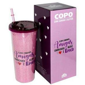 Copo Canudo Com Glitter Amigas Rosa 650Ml