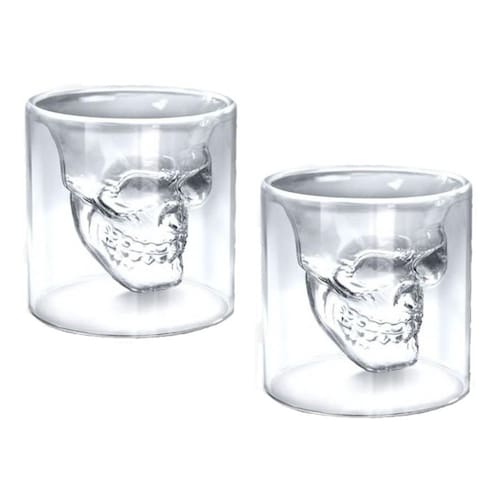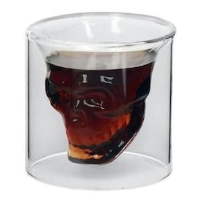 Kit com 2 copos Caveira Doomed Long Shot. O diferencial deste copo é um crânio humano na camada interna de High Borosilicate Glass e a capacidade dobrada de volume comparados aos pequenos copos shot. Para bebidas quentes ou frias -20º a 150º C . A distância da camada externa para a interna conserva a temperatura, não permitindo que a temperatura da bebida passe para a mão ou que o calor de suas mãos aqueça a bebida. Não pode ir ao lava louças nem ao microondas. Dimensões 8 cm altura x 8 cm diâmetro. Capacidade 150 ml. O valor anunciado é para 2 copos. Marca: Não Informado
