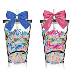 Torne cada momento da preparação para seu casamento um momento especial, iniciando com os pequenos com o Copo Convite para Pajem e Daminha. O kit acompanha duas unidades, um para o pajem e um para a daminha, com a mensagem "aceita ser nosso pajem daminha ?". Os copos são uma forma linda e deliciosa de convidar ou agradecer a quem topou fazer parte desta data tão especial. Com capacidade para 700ml você pode encher os copos com o doce favorito das crianças e encantá-las, o sim deles é garantido. Características - 2 Copos nas cores rosa e azul - Canudo transparente com laço de cetim - Ideal para convidar as crianças para serem pajem e daminha no seu casamento - Mensagem "aceita ser nosso pajem daminha ?" Especificações Capacidade: 700ml Material Copo: Acrílico Poliestireno Resistente Laço: Cetim Cor do Copo: Transparente Tampa e Canudo: Transparente Estampa: Transfer Aplicação Direto no Produto Quantidade: 2 Peças Conteúdo: 02 Copos Convite com Tampa e Canudo Transparentes com 1 Laço em Cetim Rosa e 1 Laço em Cetim Azul. Ean: 7897581922387