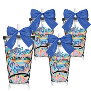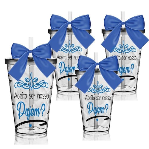 Cada detalhe importa na hora de preparar o seu casamento e esses Copos Convite para Pajem garantem o toque especial que você busca. O jogo acompanha quatro copos com a mensagem "aceita ser nosso pajem?". Os copos são uma forma linda e deliciosa de convidar ou agradecer a quem topou fazer parte desta data tão especial. Como a sua capacidade é grande, de 700ml, uma ótima ideia é encher os copos com o doce favorito das crianças e encantar os futuros Pajens. A resposta "sim" vai ficar muito mais gostosa. Características - 4 copos transparentes com detalhes em azul - Em acrílico resistente - Canudo transparente com laço de cetim - Ideal para convidar as crianças para serem pajem - Mensagem "aceita ser nosso pajem?" Especificações técnicas Marca: Krystalon Modelo: Twister Capacidade: 700ml Quantidade: 4 Material: Acrílico Poliestireno Laço: Cetim Cor Laço: Azul Cor do Copo: Transparente Tampa e Canudo: Transparente Estampa: Transfer Aplicação Direto no Produto Dimensões: 9,5 x 14,5 x 9,5 cm Peso: 120g Marca: Não Informado