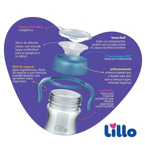 O Copo 360º Evolution com alça 240ml Lillo é recomendado para facilitar o momento de transição do copo com bebedor para o modelo convencional. A tecnologia 360º permite que o líquido seja ingerido por toda a extensão da borda e seu sistema antivazamento impede que o líquido saia sem que a criança sugue, oferecendo conforto e facilidade durante o uso diário. As alças são fáceis de segurar e foram desenvolvidas especialmente para as mãos pequenas. Sua tampa protetora é ideal para proteger o copo. Livre de Bisfenol-A. Indicado para bebês a partir de 6 meses.