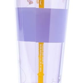 - WINNIE THE POOH: Copo temático apresenta néctar das flores pingando do aro. Escrito ao redor do centro do copo, em uma faixa roxa, é "hunny". As abelhas decoram o copo. O copo de viagem é completo com uma tampa de cúpula cheia de confetes com o Ursinho Pooh segurando um pote de néctar das flores.