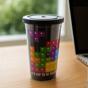 - Este copo de viagem de plástico oficialmente licenciado apresenta uma imagem de tetrominos formando um quadrado e a frase "It's hip to be square" abaixo.