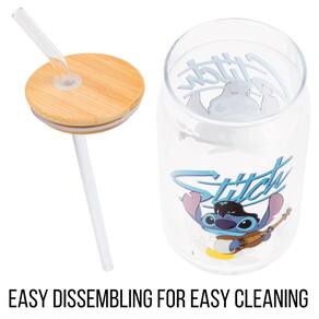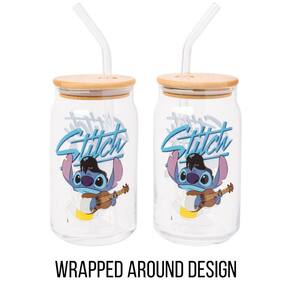- DESIGN E MATERIAL: Este copo de vidro de 473 ml apresenta um design encantador de Stitch segurando sua guitarra, em um cenário tropical. Inclui uma tampa de bambu e canudo de vidro reutilizável para um gole ecológico e elegante.