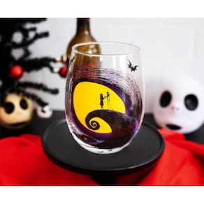- Feito para verdadeiros fãs: os planos de férias não estão indo como o esperado? Refresque-se com esta taça de vinho sem haste oficialmente licenciada, inspirada em The Nightmare Before Christmas, de Tim Burton.