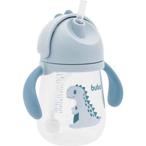 Copo com alça Buba dino azul 240ml, com canudo em silicone, possui válvula que acompanha o líquido evitando a ingestão de ar.