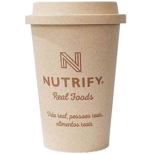 Descrição: O Copo Ecológico com Tampa Nutrify é produzido em plástico verde de fibra de bambu (50% fibras naturais e 50% resina virgem) o que lhe confere uma coloração bege clara mesclada. É livre de BPA, possui uma tampa de vedação rosqueável com abertura para saída do líquido.