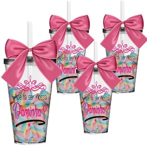 Os Copos Convite são uma forma linda e deliciosa de convidar ou agradecer os pequenos por participarem de uma data tão única. Com capacidade de 550 ml, você tem a opção de encher os copos com todo tipo de doce e assim encantar as futuras Daminhas. O sim delas será GARANTIDO 4 Copos Convite com Tampa e Canudo Transparentes com 4 Laços em Cetim Rosa. Capacidade: 550 ml Material Copo: Acrílico Poliestireno Resistente Laço: Cetim Cor do Copo: Transparente Tampa e Canudo: Transparente Personalização: Transfer Aplicação Direto no Produto Quantidade: 4 Peças