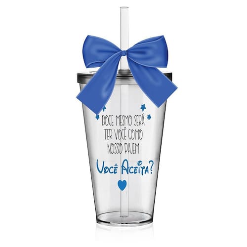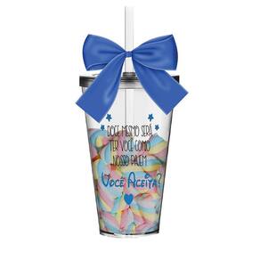 1 Copo Convite com Tampa e Canudo Transparente com 1 Laço em Cetim Azul.