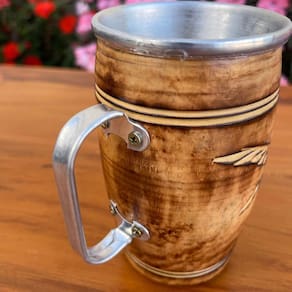 A Caneca de madeira e Alumínio é ideal para qualquer tipo de bebida. Feito em madeira maciça com acabamento em verniz e com revestimento em alumínio.