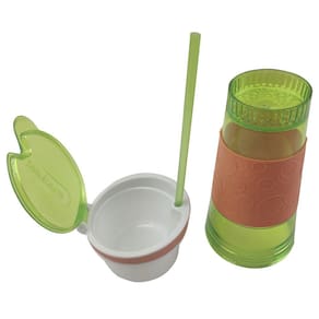 Com dois compartimentos, esse copo é ideal para crianças por seu sistema antivazamento e acabamento antideslizante de fácil manuseio.
