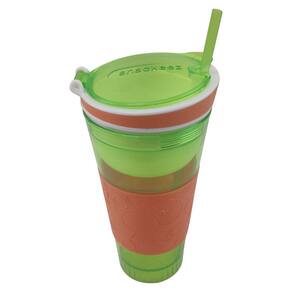 Capacidade de 500ml para bebidas e um pote acoplado com 200ml para lanches (frutas, biscoitos, etc).