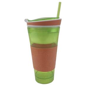 Capacidade de 500ml para bebidas e um pote acoplado com 200ml para lanches (frutas, biscoitos, etc).