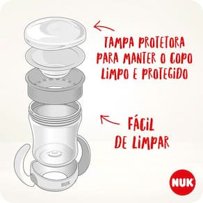 Suas alças ergonômicas são ideais para as pequenas mãozinhas. Seu sistema 360º garante a ingestão de líquido sem esforço, aliado a uma eficaz estrutura antivazamento por toda a sua borda. O copo é intercambiável e permite que o bebedor, alça e rosca possam ser utilizados em todos os frascos da linha NUK Evolution. É recomendado para crianças a partir de 6 meses de idade.