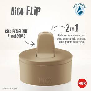 Ele possui Bico Flip com sistema abre e fecha, é super resistente a mordidas, é antivazamentos e pode ser utilizado tanto como um copo com canudo ou como uma garrafa sem o canudo. Além disso, ele é totalmente livre de BPA, de fácil higienização podendo ir a lava-louças e conta com tampa protetora higiênica para transporte com sistema de clique simples para abertura e fechamento.
