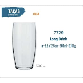 Copo de Vidro Oca 300 - Cerveja, suco, refrigerante, água, entre outros 12 unidades Volume 300 ml Altura 12,5 cm Diâmetro 6,6 cm Despacho Imediato Marca: Não Informado Ean: 7893918331822