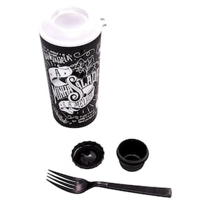 Altura: 18 cm Largura: 9 cm Capacidade: 600 ml Material: Plástico PP Conteúdo: 1 copo, 1 tampa, 1 molheira e 1 garfo