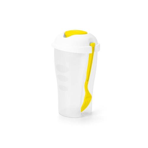 Este copo para salada é feito de plástico ps policarbonato de alta qualidade e tem capacidade para até 800ml. Em seu corpo, com design anatômico e moderno, é acoplado um prático garfo de plástico, não necessitando se preocupar em levar ou esquecer o seu talher. Possui uma tampa de encaixe para melhor acondimentar a sua salada e conta com um recipiente dedicado para o molho da sua salada com capacidade para 60ml.