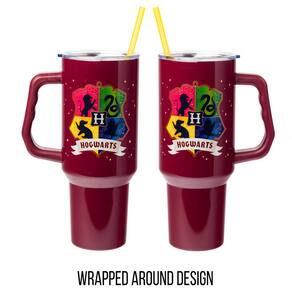 Silver Buffalo Copo de aço inoxidável Harry Potter Hogwarts com Grifinória, Corvinal, Sonserina e Lufa-Lufa Copo de aço inoxidável com alça e canudo, cabe em porta-copos padrão, 1,134 g