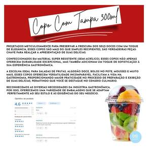 Com a tampa sem furo e sem divisória, este copo oferece praticidade incomparável para o consumo de sobremesas geladas, saladas verdes, sorvetes e muito mais. Além disso, ele adiciona um toque de elegância à sua apresentação, preservando a frescura dos seus doces e surpreendendo seus clientes com uma experiência visualmente cativante.