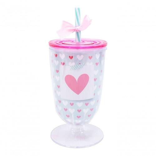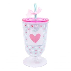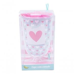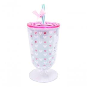 Copo formato taça com canudo e tampa. Copo com capacidade para 600 ml, estampa com corações e escrito pra você não esquecer: amo você. Canudo vem ainda com um lacinho. Material: plástico
