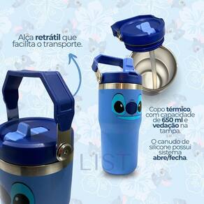 Copo Garrafa Térmica Stitch - 650ml Inox com Tampa de Vedação, Canudo de Silicone e Alça Retrátil