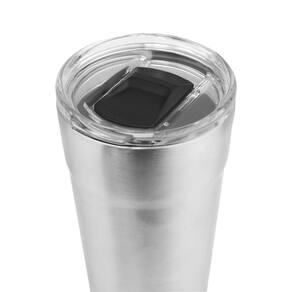 O copo também vem com uma tampa de plástico transparente, equipada com uma trava deslizante para facilitar o uso, e um abridor de garrafas integrado, proporcionando praticidade em qualquer situação.