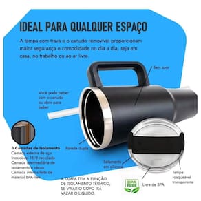 Copo Térmico com Canudo 40oz - Garrafa Térmica Inox Mantenha suas bebidas na temperatura ideal por horas Este copo térmico de 40oz 1,2 litros é a solução perfeita para quem busca praticidade e eficiência térmica. Fabricado em aço inoxidável de alta qualidade com tecnologia de isolamento a vácuo de parede dupla, mantém bebidas quentes por até 8 horas e geladas por até 12 horas. O design ergonômico inclui alça resistente para transporte confortável e seguro. A tampa possui sistema de vedação hermética que evita vazamentos, enquanto o canudo reutilizável proporciona experiência de consumo prática e higiênica. Ideal para academia, escritório, viagens, caminhadas e uso diário. A base antiderrapante garante estabilidade em qualquer superfície. O material inox é livre de BPA, atóxico e não retém odores ou sabores. Especificações técnicas: Capacidade: 40oz 1,2L Material: Aço inoxidável 304 Isolamento: Parede dupla a vácuo Inclui: Tampa com vedação + Canudo reutilizável + Alça ergonômica IMPORTANTE: A cor do produto é e será enviada aleatoriamente conforme disponibilidade em . Você pode receber qualquer uma das cores disponíveis azul, verde, rosa, preto, branco, turquesa, etc. . Todas as cores possuem a mesma qualidade e funcionalidade.